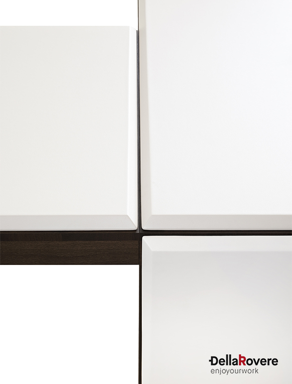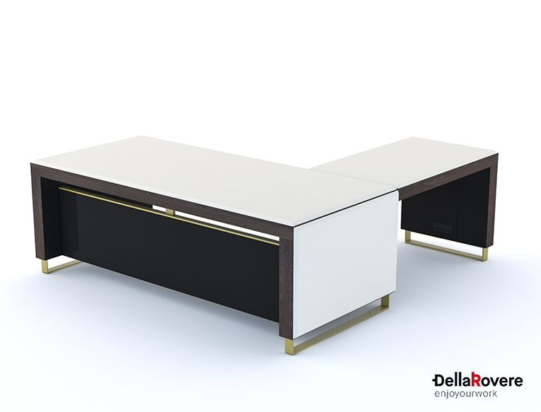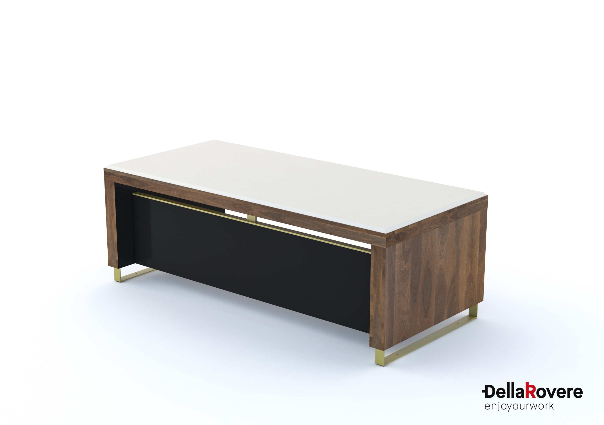 Una copertura interrotta solamente dagli elementi distanziatori in acciaioottonato, tratto distintivo di Della Rovere, che sagomano i profili di questa scrivania.